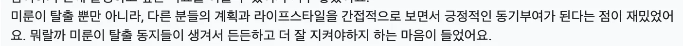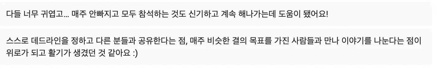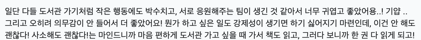 어떤 목표를 이루는데 있어서 누군가랑 같이하면 그 같이 하는거에서 오는 긍정적인 영향이 있을거라고 막연하게 생각했는데 생각보다 이게 우리한테 꽤나 큰 영향을 줬나봐요! 진짜 한분도 빠짐없이 클럽 맴바들 영향에 도움 받았다고 하는거 보고 진짜 핵 깜놀했어여 ㅇㅅㅇ