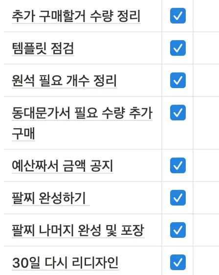 예시 명상팔찌 텀블벅하기 라는 목표 아래 필요한 내용을 ‘행동’ 단위로 적음