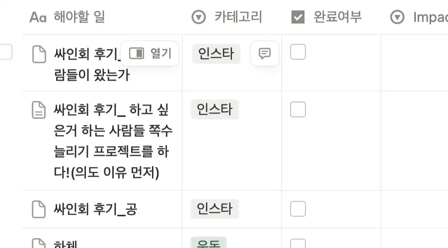 머릿속에 떠오르는 해야할 ‘생산적 행동’을 모두 적는다. 여기서 생산적이다란 뜻은 ‘타인이 경험할 수 있는 output 을 만드는 것’ 꼭 도움이 안되도 좋음!